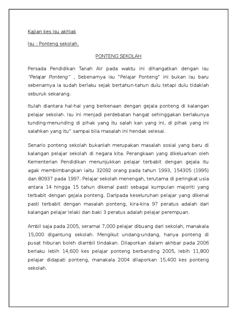 Ramai jugak orang sokong tindakan pelajar saman guru dan ada jugak yang kata pelajar tu kurang ajar sebab berani. Sebanyak 3012 kes penyakit tangan kaki dan mulut HFMD direkodkan di Pulau Pinang berbanding 144 kes yang dicatat dalam tempoh sama tahun lepas. FAKTOR-FAKTOR PENYEBAB PONTENG Terjadinya kes ponteng adalah disebabkan oleh beberapa fakor.