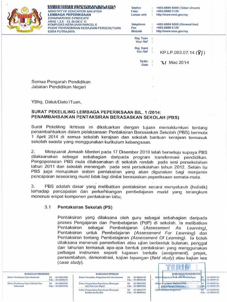 Jadual kerja pelaksanaan pbs diedarka kepada pentaksir dan ditampal. Pindaan Surat Pekeliling Lembaga Peperiksaan Bil. Surat Perkeliling PBS 2014 Read more Education Recommended.